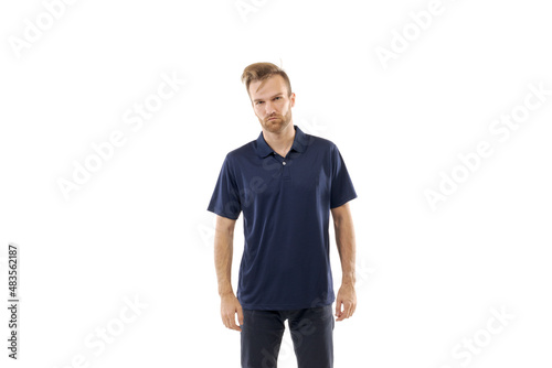 A middle-aged white man wearing a uniform standing over isolated white background. He looks happy and smiles. Worker and builder concept.