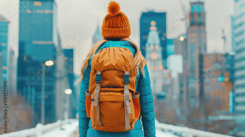 A middleaged woman explores the city streets, equipped with her backpack, embracing the joy of solo travel and adventure.
