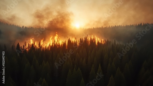 A mighty wildfire aggressively devours a dense forest at sunset, with flames reaching high against the sky, embodying nature's uncontrollable power and peril.