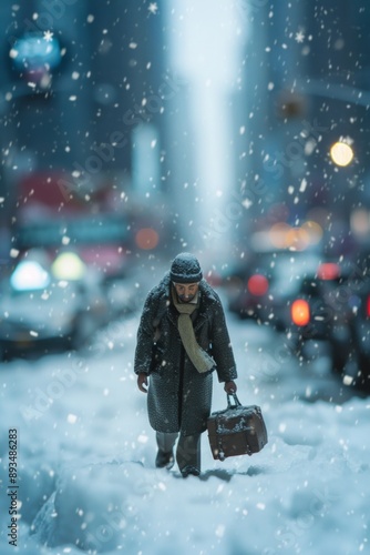 A mini figure commuting through a snowy cityscape, bundled up in a coat and scarf