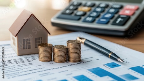 A miniature house, coins, calculator, and documents suggest financial planning for real estate.