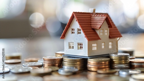 A miniature house model sits atop a stack of coins, symbolizing a thoughtful savings plan and investment strategy in real estate. The image features ample copy space to convey messages related to