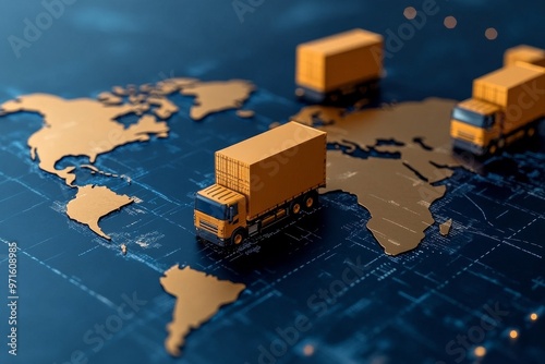 A miniature world map with trucks symbolizing international shipping, global trade, transportation networks, delivery services, and worldwide connectivity.