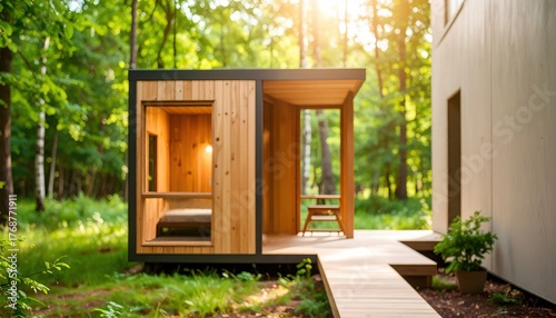 A minimal wooden cabin surrounded by lush forest sunlight streaming in ideal for eco-tourism, retreats, and sustainable architecture
