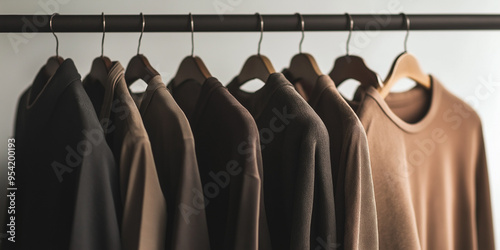 a minimalist and elegant wardrobe display featuring a selection of chocolate-colored clothing items, such as shirts, camisoles, and pants, arranged with a refined simplicity