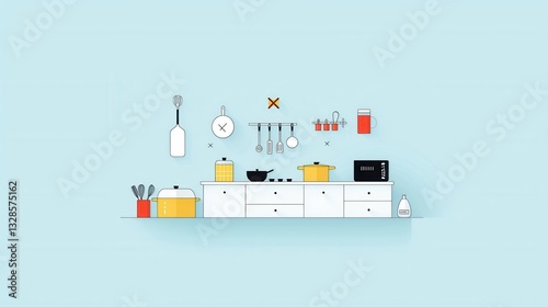 A minimalist and organized arrangement of 15 clean simple kitchen related icons and objects on a white shelf against a light blue background