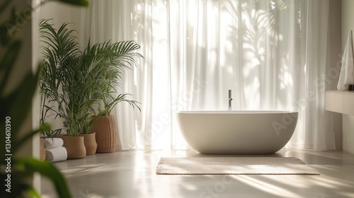 A minimalist bathroom, adorned with a sleek white shower curtain and a verdant plant, invites viewers to step into a haven of serenity, bathed in natural light.