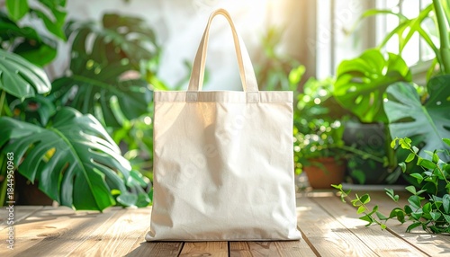 A minimalist canvas tote bag placed centrally on a rustic wooden table, surrounded by lush green indoor plants including monstera leaves and pothos vines. Soft morning light filters through the foliag