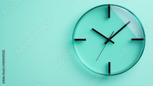 A minimalist clock with a transparent glass face and black hands on a light blue background.