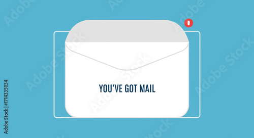 A minimalist digital illustration features an open white envelope displaying "You've Got Mail" with a red alert icon, representing new online communication.