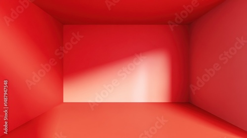 A minimalist digital rendering of an empty red room, showcasing a subtle gradient and light source creating a soft shadow on one wall. Ideal for background or product placement. : Generative AI