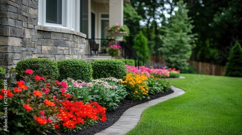 A minimalist front yard with small flower beds and a neatly arranged landscape.