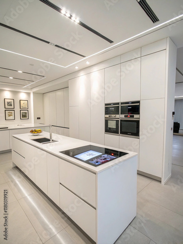 A minimalist futuristic kitchen in all-white with smart appliances, a central island with an integrated touch-screen cooktop