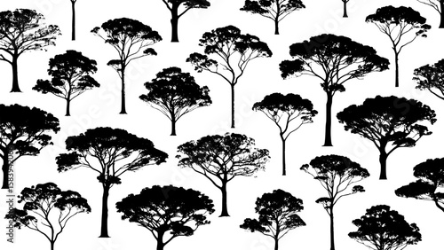 A minimalist graphic featuring 100 bird's-eye view silhouettes of tree canopies only, in black on white. Each tree has a unique crown shape, arranged tightly in a uniform grid, with no trunk detail or