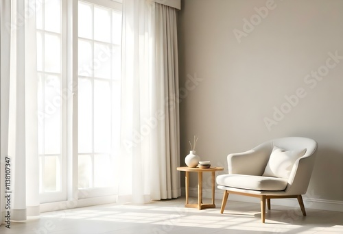 A minimalist living room with a white armchair, a wooden side table, and a large window with sheer curtains letting in natural light