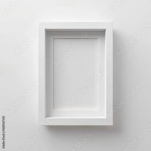A minimalist, rectangular white picture frame with a double border, mounted on a plain white wall