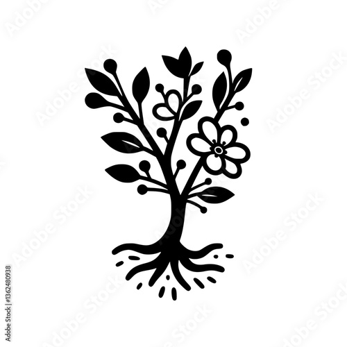 A minimalist silhouette of a flowering tree with roots, rendered in black and white, symbolizing growth and nature's beauty against a blank backdrop.