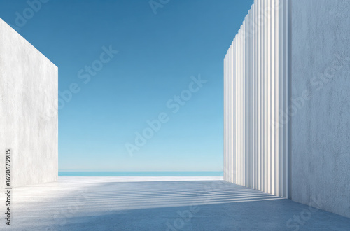 A minimalist white architectural space with clear blue sky and sea view, featuring clean lines and ample light casting shadows.