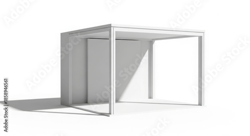 A minimalist white outdoor structure with a flat roof and partial side panels, casting a shadow on a white background.