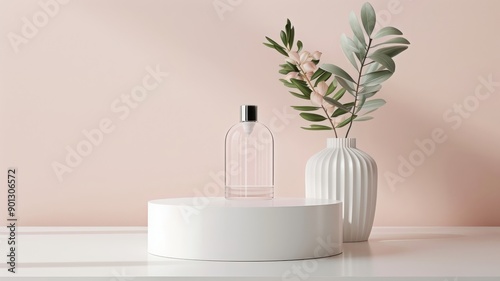 A minimalist white podium with a perfume bottle against a backdrop of pastel-colored smoke.