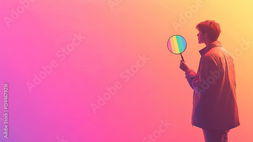 A minimalistic surreal illustration of a person holding a magnifying glass that transforms everything behind it into Pride colors