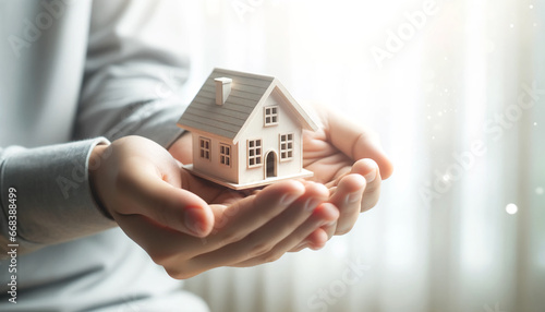 A model house resting on open palms. Insurance concept. Real estate concept Ai generative.