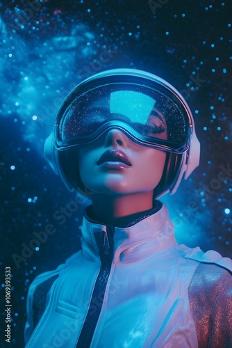 A model in a sci-fi inspired space suit or futuristic astronaut