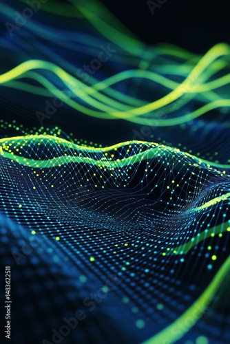 A modern, abstract design with fluid, intersecting waves of electric blue and neon green that represent the seamless flow of data.