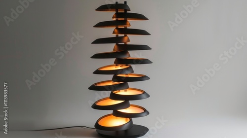 A modern, artistic lamp featuring layered circular shades emitting warm light.