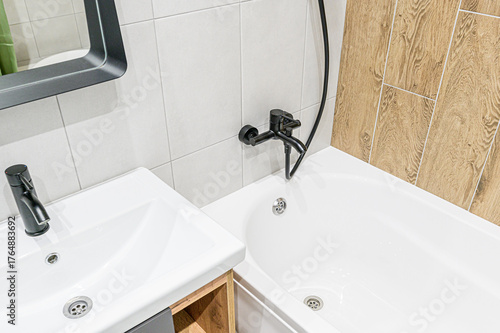 A modern bathroom featuring a white sink and bathtub with black fixtures, complemented by light gray and wood-patterned tiles. The space is clean, bright, and well-maintained