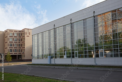 A modern building with a glazed facade.