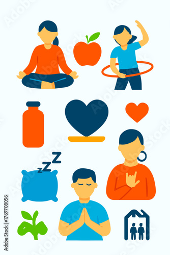 A modern collection of flat design icons depicting essential components of a healthy lifestyle, focusing on physical fitness, mental well-being, nutrition, and restful sleep.