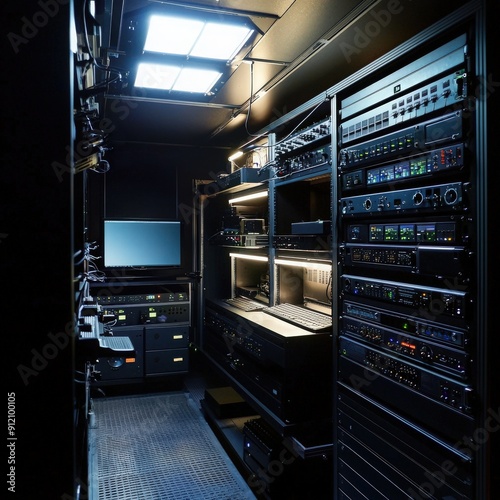 A modern control room featuring an array of digital equipment and illuminated panels for optimized performance.