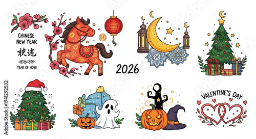 A modern digital art illustration featuring abstract vector designs of holiday symbols on a colorful background