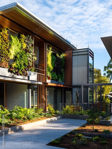 A modern family home with eco-friendly features, such as solar panels, rainwater harvesting, and a living wall. -