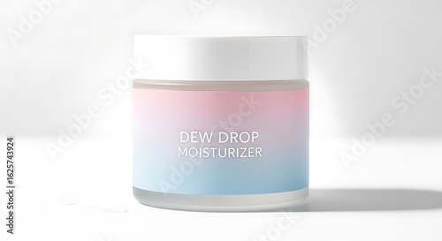 A modern frosted glass jar of 'Dew Drop Moisturizer' with a soft pink and blue blended gradient, representing a light skincare product.