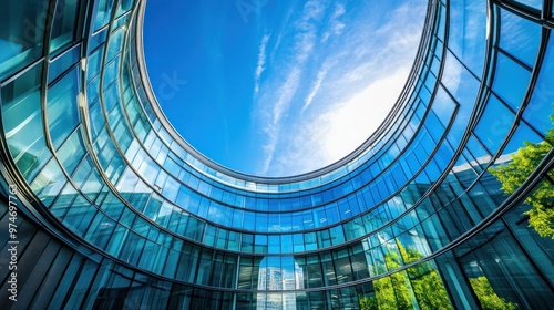 A modern glass building with a circular design and blue sky.