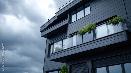 A modern home features stylish windows and decor beneath an expansive cloudy sky, creating an urban vibe.