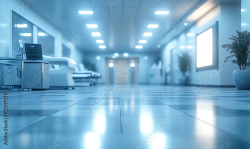 A modern hospital corridor with bright lighting, clean floors, and minimal furnishings, creating a calm and sterile environment.