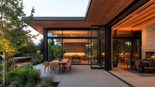 A modern house with large glass windows showcases spacious interior and outdoor dining area, surrounded by lush greenery and warm lighting, creating serene atmosphere