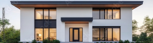 A modern house with minimalist design, featuring large windows and a sleek facade, surrounded by greenery.