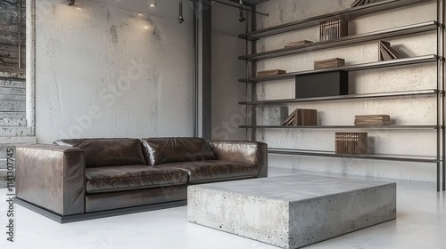 A modern industrial-style living room interior isolated on white, with a sleek leather sofa, a concrete coffee table, and exposed shelving featuring metal accents. The design balances raw materials