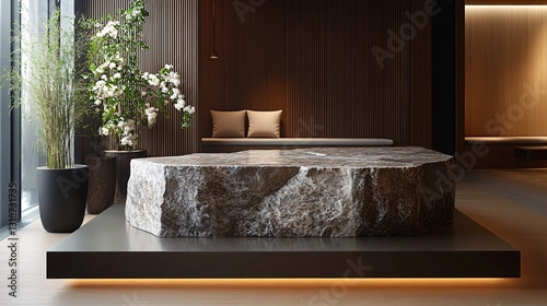 A modern interior design featuring a large stone coffee table