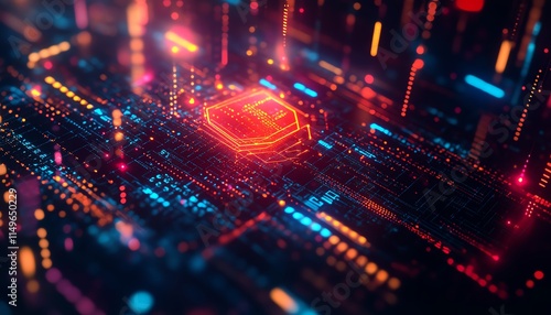 A modern IT security concept with a glowing shield, secure networks, and firewall symbols, surrounded by flowing data and digital elements