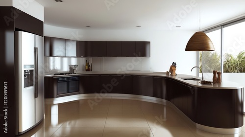 A modern kitchen with curved dark brown cabinets, stainless steel appliances, and glossy beige flooring