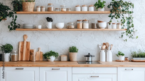 A modern kitchen with wooden shelves, plants, and organized jars for a fresh, inviting look.