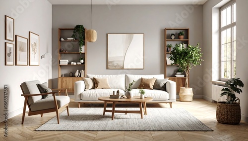 A modern, minimalist living room with warm, neutral tones, featuring wooden furniture, a light-grey rug, and potted plants, creating a calm and inviting atmosphere.