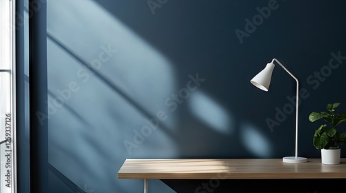 A modern minimalist workspace with dark blue walls, a wooden work table, and a white desk lamp.