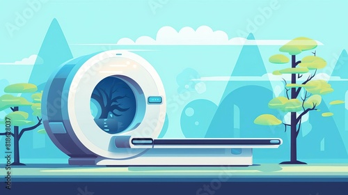 A modern MRI machine illustration in a serene outdoor setting with trees and clouds in the background, depicting advanced medical technology.