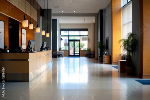 A modern reception area featuring a sleek desk, plants, and natural light from large windows, creating an inviting atmosphere.